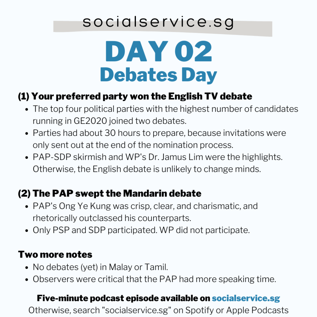 2 thoughts on “#GE2020 Debates Day (Day 02): Your preferred party won the English TV debate; the PAP swept the Mandarin debate”
