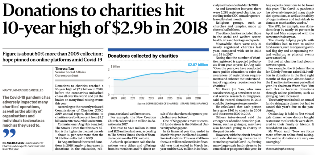 Donations hit record $2.9 billion in 2018, but charities expect collections to fall this year due to pandemic (The Straits Times, October 23, 2020)