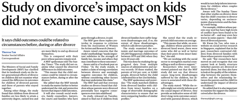 Study on divorce’s impact on kids did not examine cause, says MSF (The Straits Times, December 13, 2020)